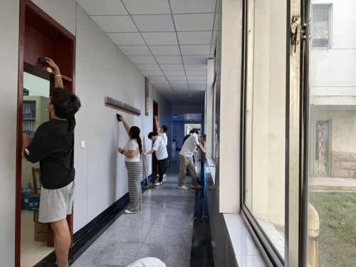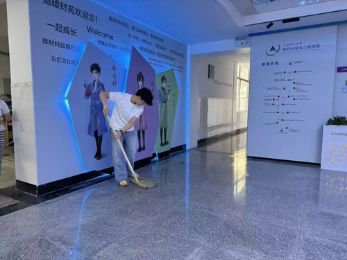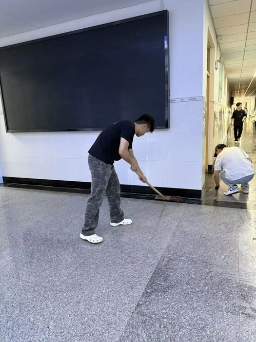 活动中,党员同志们用扫帚、拖把、抹布、铲子等工具分工协作,重点清理教学楼走廊、楼梯间的散落垃圾,以及学院阳台的顽固污渍。同志们不怕脏、不怕累,干劲十足,用实际行动营造洁净优美的学院环境。