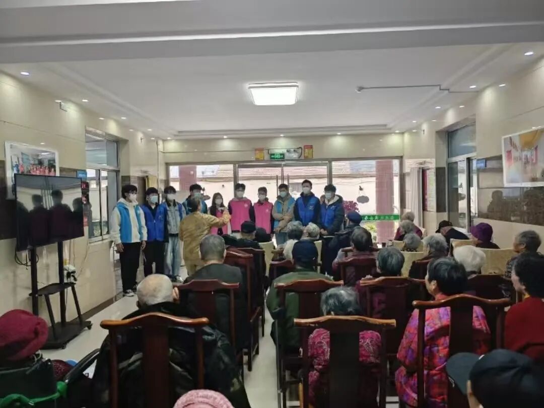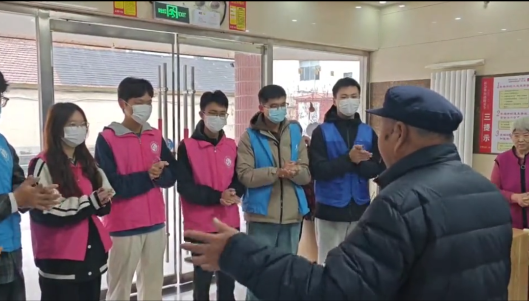 清洁结束,志愿者与老人们围坐在活动室开展歌唱互动。志愿者先唱起激昂的《歌唱祖国》,老人们眼神专注聆听、跟着节奏轻点头,偶尔轻声附和。随后《人民军队忠于党》响起,董老爹起身指挥,带领学生们大声歌唱,爱国主义的情怀在每个志愿者心中流淌,振奋人心。活动室中志愿者们与老人其乐融融,共同享受着音乐的美好。