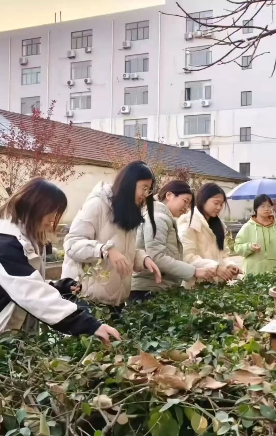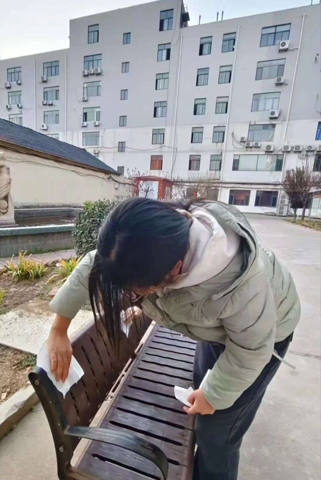 与此同时,另一组志愿者投身于公共区域的环境美化工作。他们默契协作,仔细擦拭休闲区的桌椅与走廊扶手,认真整理公共设施,并彻底清扫园区内的落叶。通过这番细致扎实的劳作,敬老院的户外环境焕然一新,为老人们营造了更为整洁、舒心的生活空间。