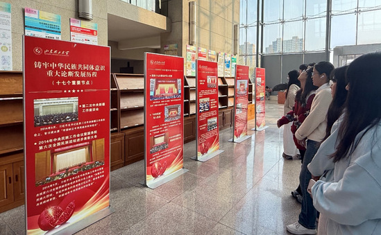 随后,党员发展对象前往“铸牢中华民族共同体意识” 主题展参观。展览围绕主题设置六个板块,全面涵盖了习近平总书记关于加强和改进民族工作的重要思想、党的民族工作政策法规、新时代民族工作历史性成就及学校民族工作实践等内容。在参观过程中,党员发展对象频频驻足观看,在成就展示中感受各民族 “休戚与共、荣辱与共、生死与共、命运与共”的强大凝聚力,进一步深化了对中华民族共同体理念的认知。