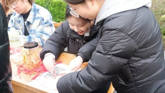 在“药香满囊,祈福安康”的传统香囊制作中,同学们沉浸于千年古韵,感受传统文化魅力。香囊承载着同学们对老人们的美好祈愿,传递着温情与幸福安康的愿景,恰似“小小香囊,承载万情”。同学们用香囊为老人们送上独特祝福,让非遗文化在日常生活中焕发生机,融入年轻人的日常,成为对传统文化的传承与热爱的生动实践。